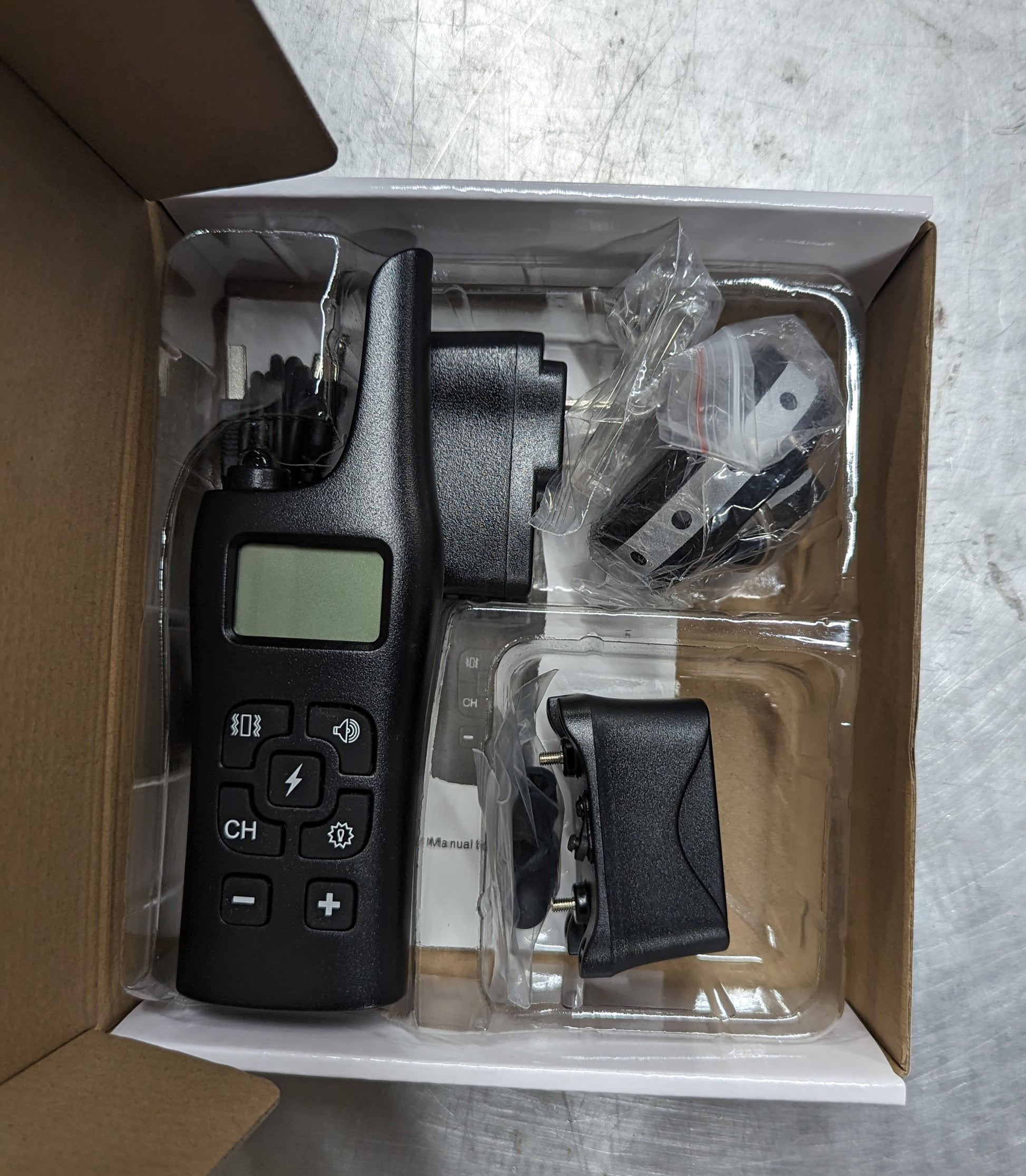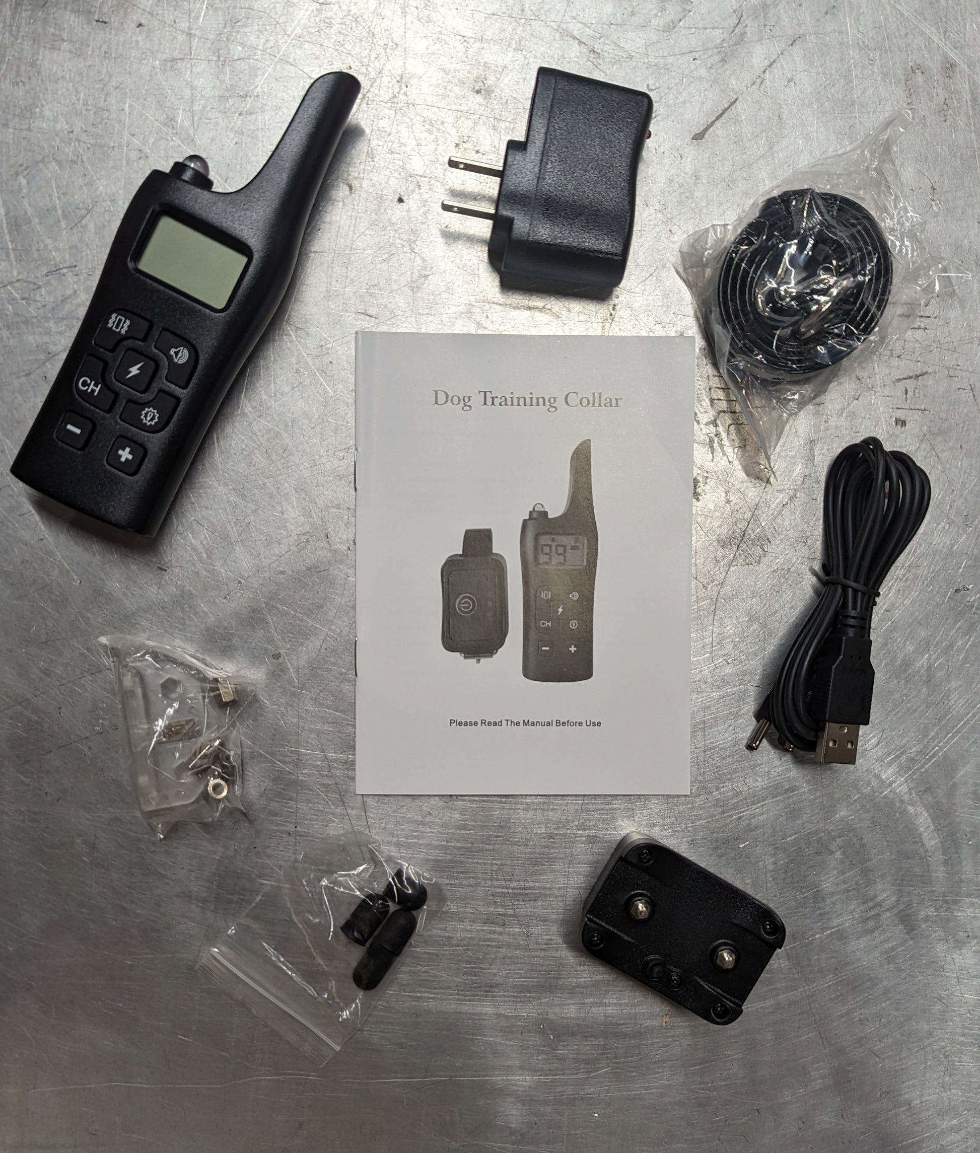 The Canine Waterproof Dog Training Collar package includes: 1 dog training collar receiver 1 dog training collar remote 1 neck hanging strip for remote 2 PU dog collars 1 reflective dog collar 1 dog training collar testing light 1 2-in-1 charging cable 4 rubber covers The collar has 4 training modes - shock, vibration, LED light mode, and beep mode, all of which can be controlled via the remote.