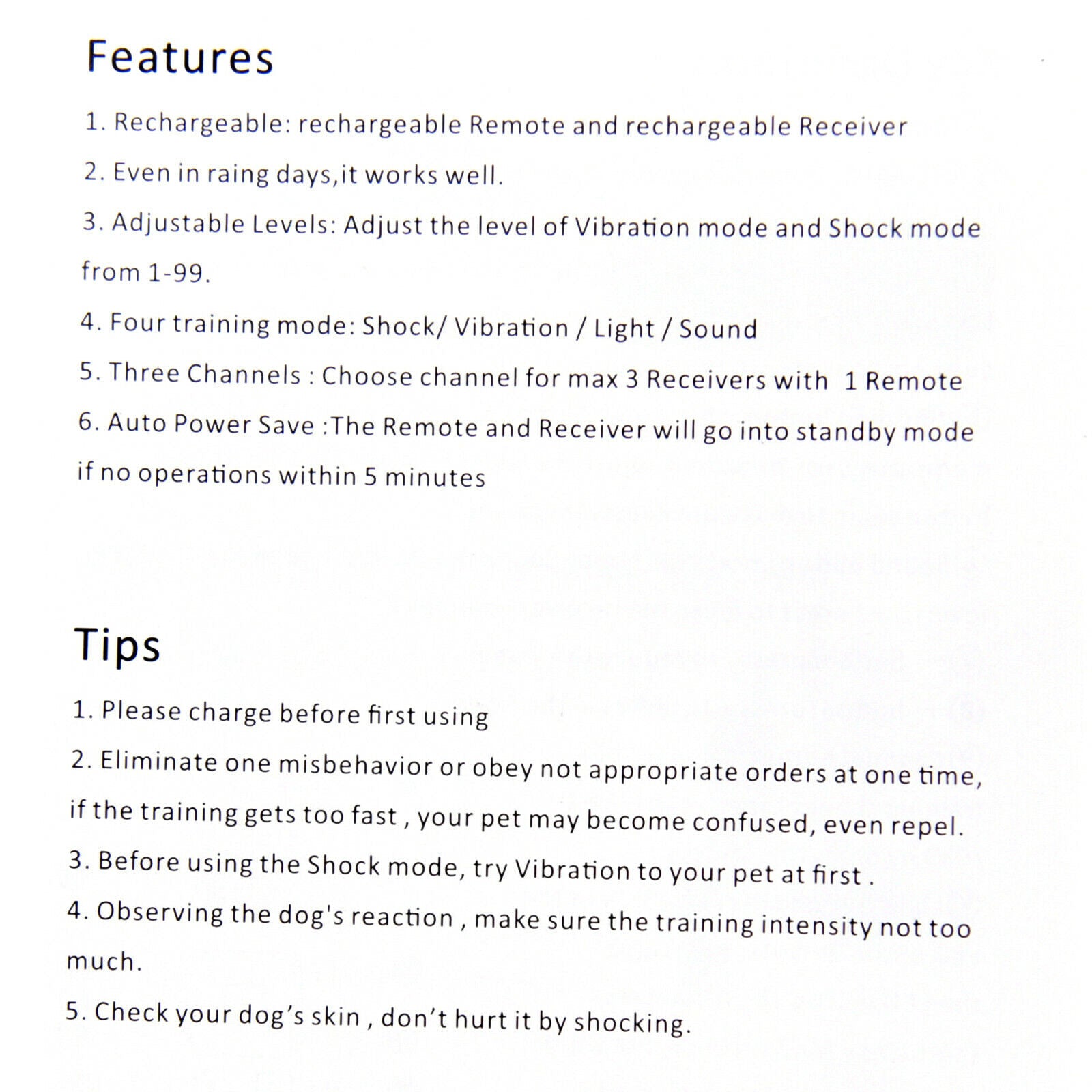 The remote also supports up to 3 dogs training with only 1 remote transmitter. The collar has an extra-long life and rechargeable battery, and the receiver is IPX8 waterproof. Don't miss out on the opportunity to train your dog with the best tool in the market! The Canine Waterproof Dog Training Collar is the perfect choice for pet owners who want a safe and effective training method.